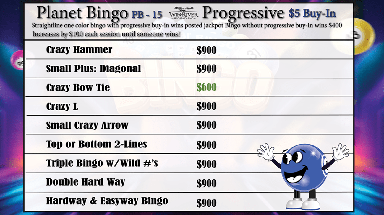 Get ready for fun, excitement, and great prizes! Regular Sessions consist of nine games, each at $400. An optional extra $5 buy-in chance to win the posted PROGRESSIVE. Paper Packs start at $30 for two books and twelve cards. PhD™ Devices start at $42 for eight books and forty-eight cards, with three buy-in levels available. $1,199 Specials are twelve games at $1,199 each. Paper Packs start at $35 for three books and eighteen cards. PhD™ Devices are $100 for twenty books and one hundred twenty cards. Add-on specials include: Speed $1, Bonanza $5, Double Action $3, Warm-ups $5, 3-Way Chance $3, and Hotball is $5. Download a copy of the most current Bingo Calendar HERE