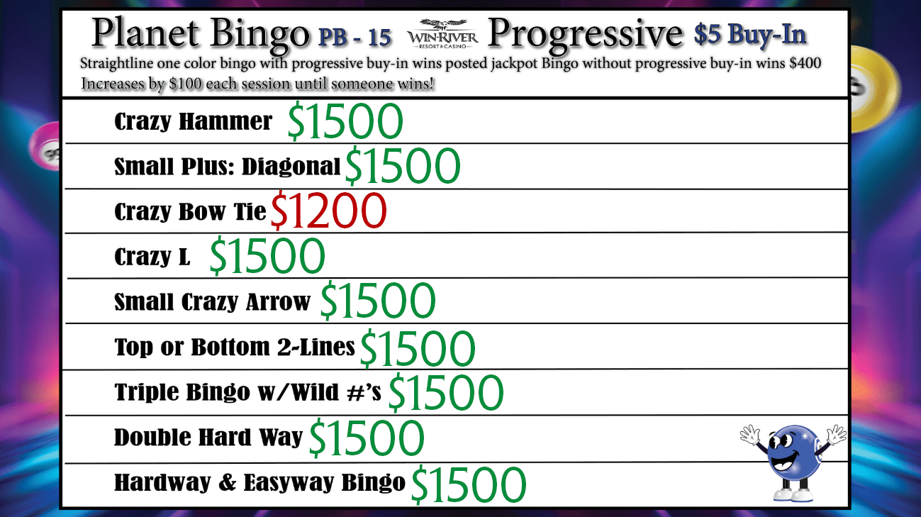 Get ready for fun, excitement, and great prizes! Regular Sessions consist of nine games, each at $400. An optional extra $5 buy-in chance to win the POSTED PROGRESSIVE. Paper Packs start at $30 for two books and twelve cards. PhD™ Devices start at $42 for eight books and forty-eight cards, with three buy-in levels available. $1,199 Specials are twelve games at $1,199 each. Paper Packs start at $35 for three books and eighteen cards. PhD™ Devices are $100 for twenty books and one hundred twenty cards. Add-on specials include: Speed $1, Bonanza $5, Double Action $3, Warm-ups $5, 3-Way Chance $3, and Hotball is $5. Download a copy of the most current Bingo Calendar HERE