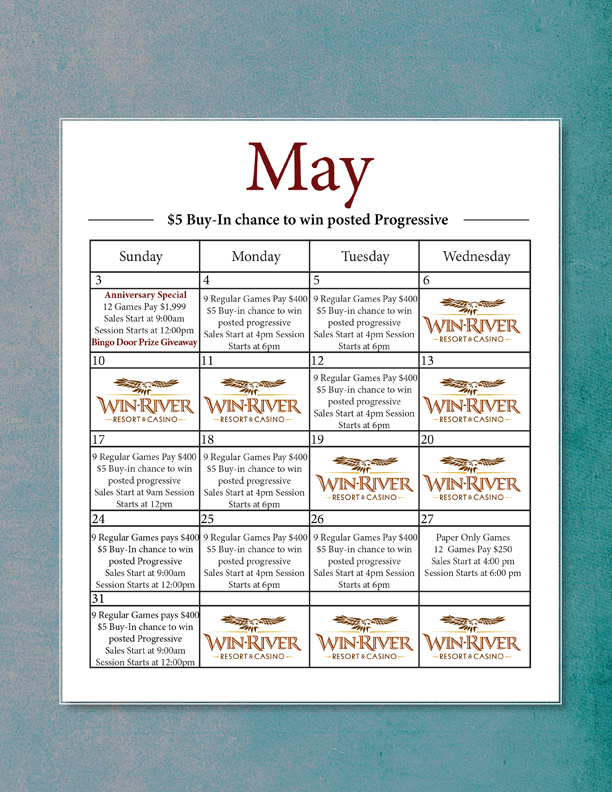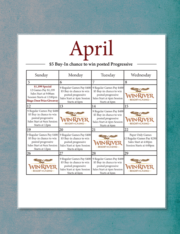 See Seasons for details. Win-River Resort & Casino reserves the right to change, modify or cancel this promotion at anytime without prior notice. Game responsibly, gambling problem please call 1-800- GAMBLER (426-2537).